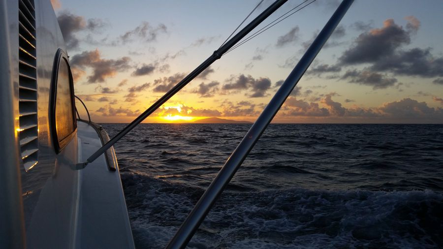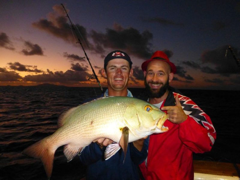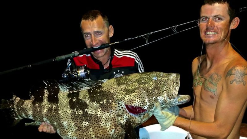 Ein Tag frustrierte uns ganz besonders. 3 Boote um uns herum hakten am Abend innerhalb von ca. einer Stunde große Blacks und wir hatten mitten drin keinen Fisch hinter unserem Boot. Bei der Fahrt zum Ankerplatz ließen wir noch einen Wobbler an der Jiggingrute laufen und bekamen bei Sonnenuntergang einen Monsterbiss. Es war ein sehr großer Hundezahnthunfisch, der mich innerhalb von 15 Sekunden komplett gespult hat. 350 Meter, 100 lbs Leine bei strammer Bremseinstellung förmlich runtergerissen. Die Schnur hing nur noch am Spulenknoten fest und meine Arme wurden immer länger. Es dauerte noch gefühlt 2 Sekunden und dann hat es den 50 lbs Wirbel am Wobbler zerlegt und der Fisch war weg…