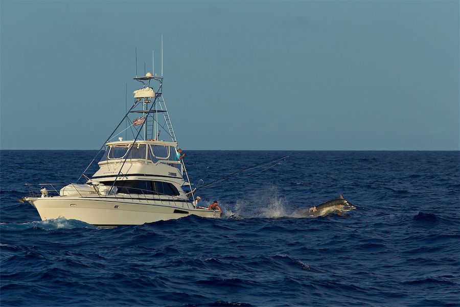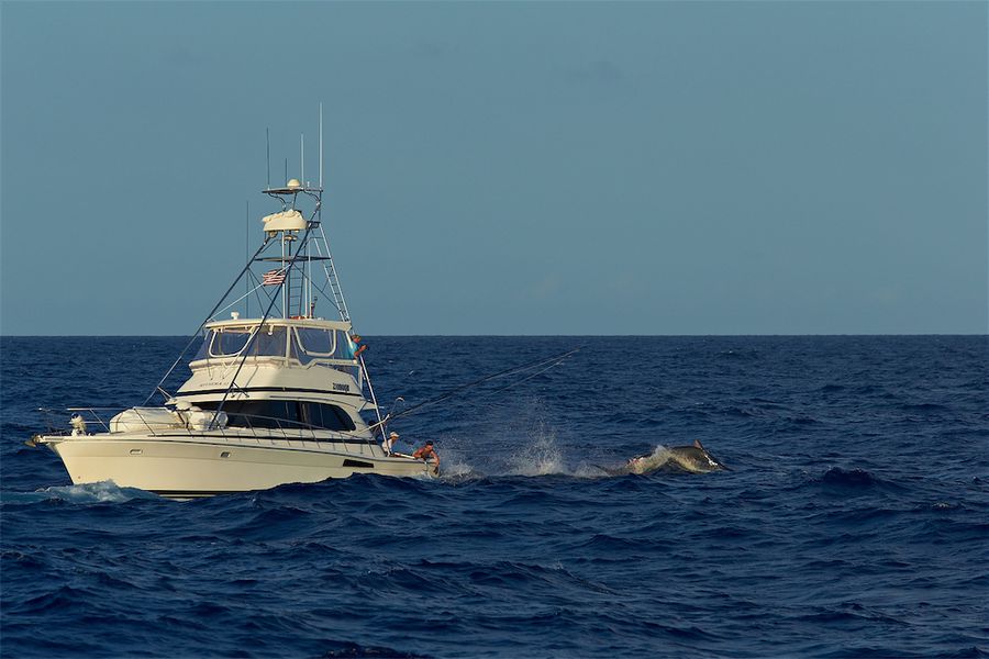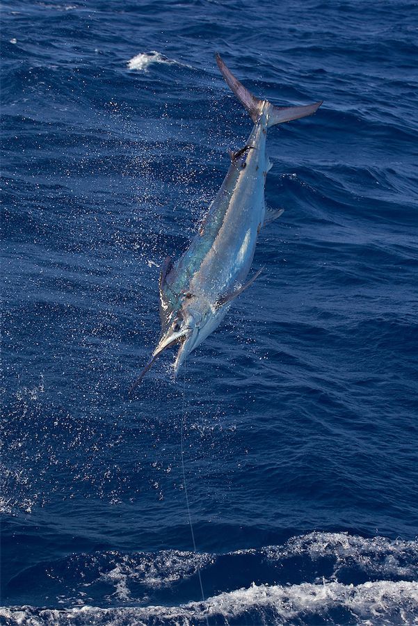 Wir hatten insgesamt in 12 Tagen nur 9 Bisse und fingen davon 4 Black Marline mit geschätzten Gewichten von 80 lbs (beim Köderfischangeln), 150 lbs, 350 lbs und 500 lbs. Die weiteren 5 Marline hinter unserem Boot waren zwischen 300 und 450 lbs schwer.