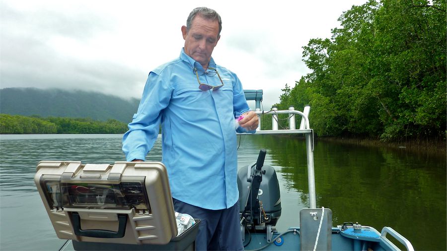 Zu Beginn der Tour widmete ich zwei Tage dem Fliegenfischen mit Guide Terry Holeman. Wir fischten den ersten Tag am Daintree River und den 2. Tag am Johnson River bei Innisfail. Die Bedingungen waren allerdings für diese beiden Tage alles andere als gut. Trübes, braunes Wasser, Regen und Wind machten uns zu schaffen. Trotz alledem fingen wir einige kleinere Barramundis und ein schönes größeres Exemplar dieser Gattung. Nebenbei gingen noch ein paar Minitarpons, Queenfische Jacks und fast ein Krokodil ☺ an den Haken.
