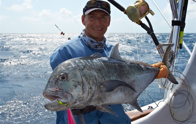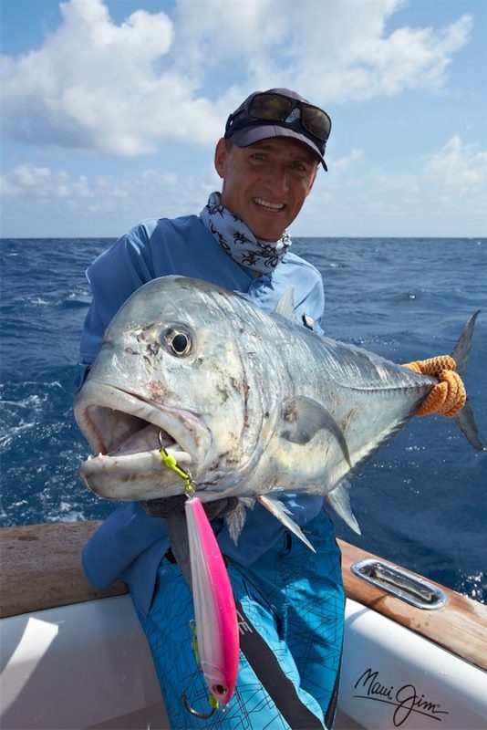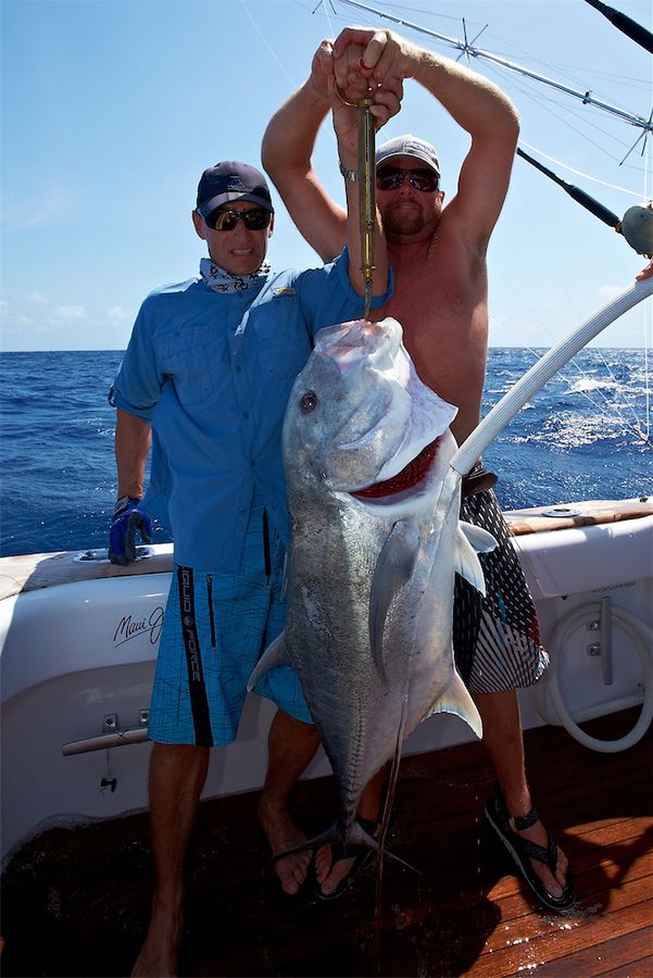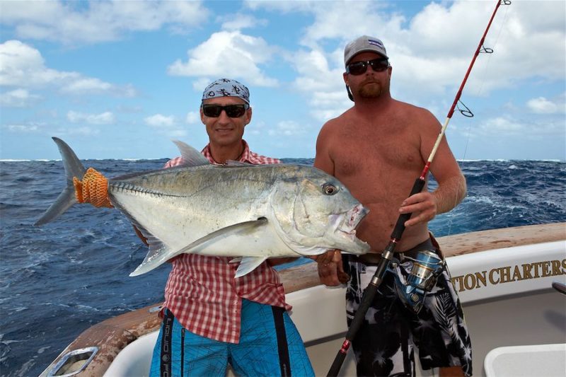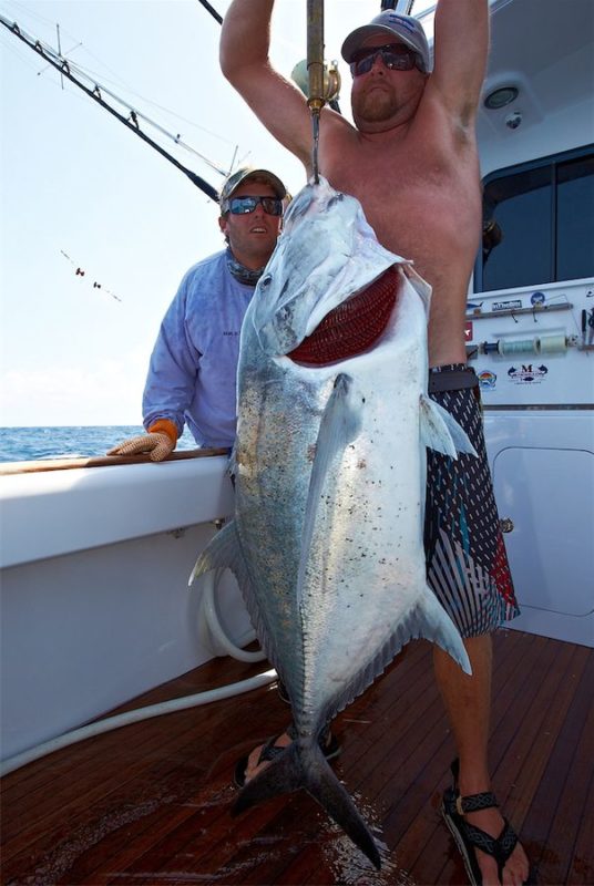 Die erste Woche unseres Angelns fiel in die Vollmondphase und wir hatten exzellente Bedingungen zum Popperfischen. Wir hatten den richtigen Platz am Riff gefunden und bekamen einige Bisse von teilweise kapitalen Exemplaren. Ich hab mir leider keine Notizen über die Anzahl unserer gefangenen GT’s gemacht – es waren Etliche. Das Durchschnittsgewicht lag bei 20-25 kg. Die vier größten GT’s der Tour hatten Gewichte von 32, 42, 44 und 48 kg.