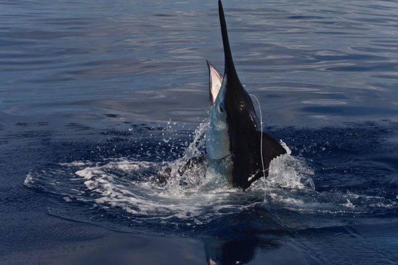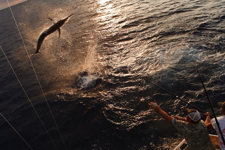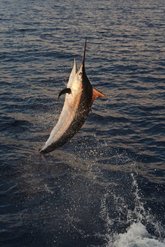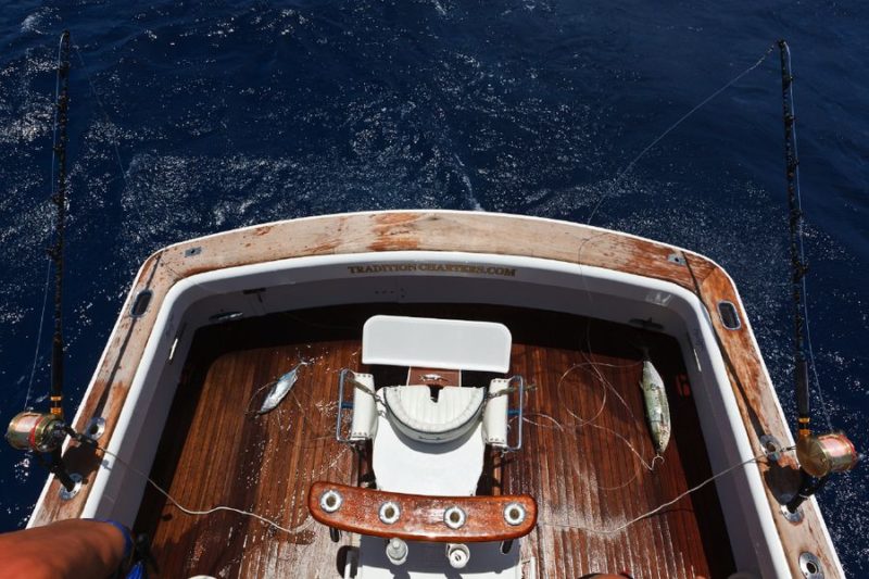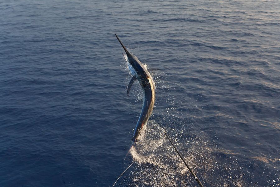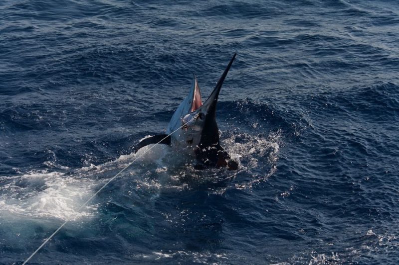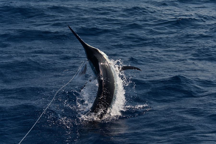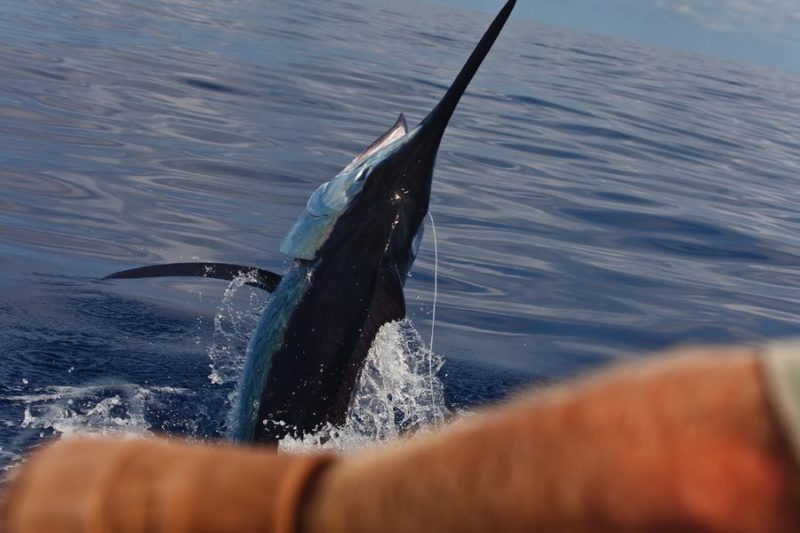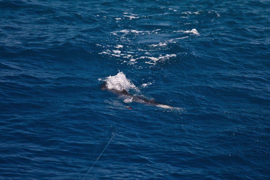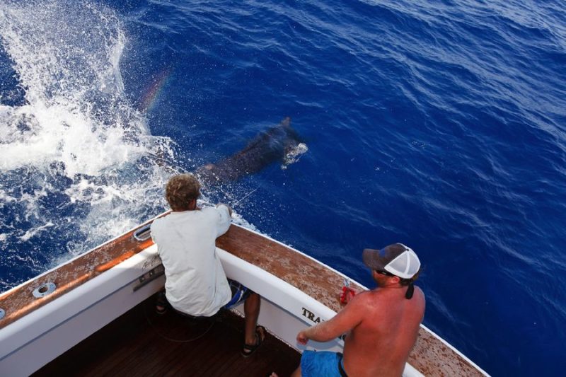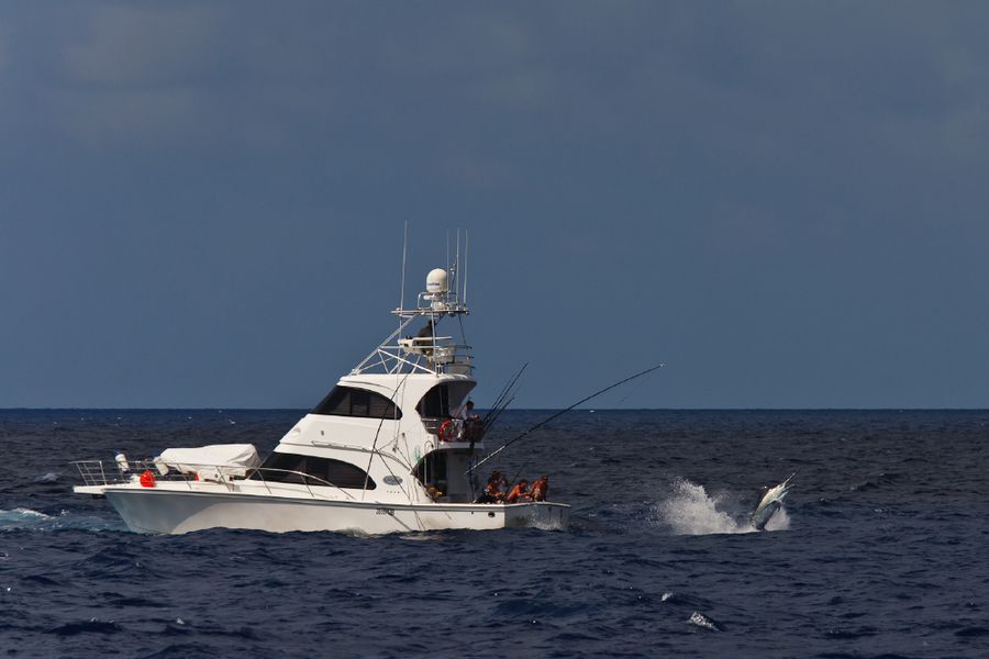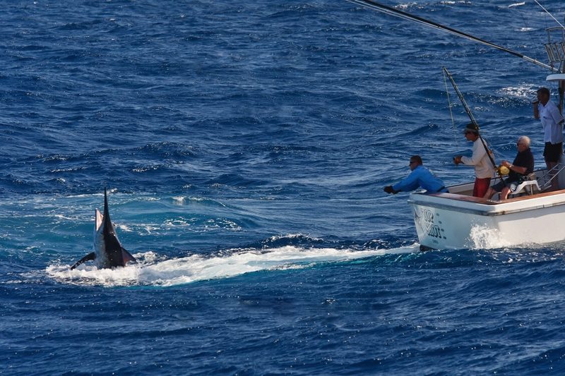 Während der ganzen Zeit laufen immer vier Kameras mit: Zwei an Deck, eine auf dem Tuna Tower – in diesem steht der Kapitän, unabhängig von Wetter und Seegang, während der ganzen Marlinjagd! Auch läuft eine Unterwasserkamera mit; diese Bilder werden auch zeitgleich auf einem großen Flatscreen an Bord gezeigt und aufgezeichnet. Hat der Skipper einen Marlin gesichtet, meldet er sofort laut nach unten: „Markt one“ – Adrenalin ohne Ende und eine Gefühlsachterbahnfahrt ist dabei garantiert!