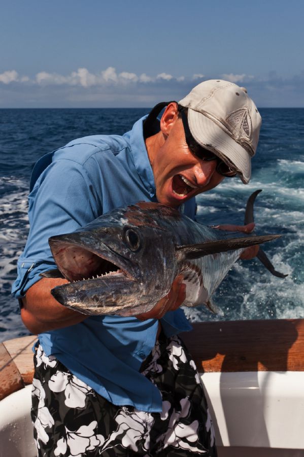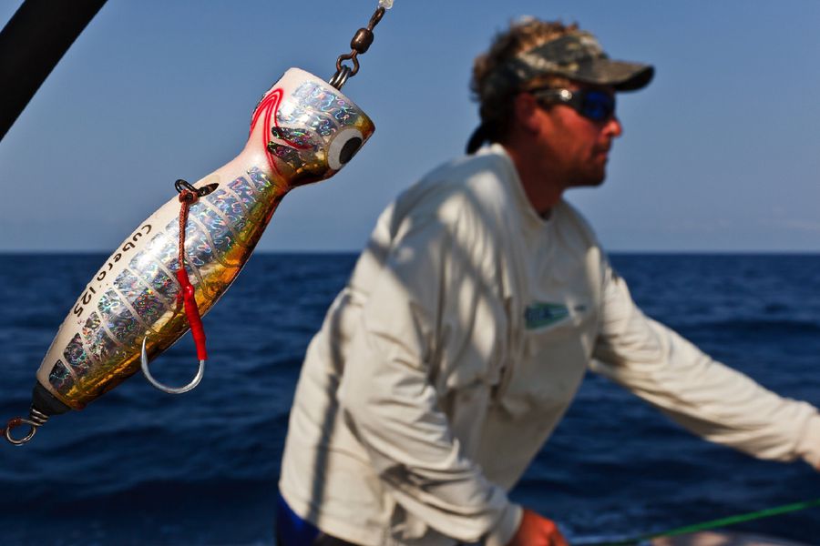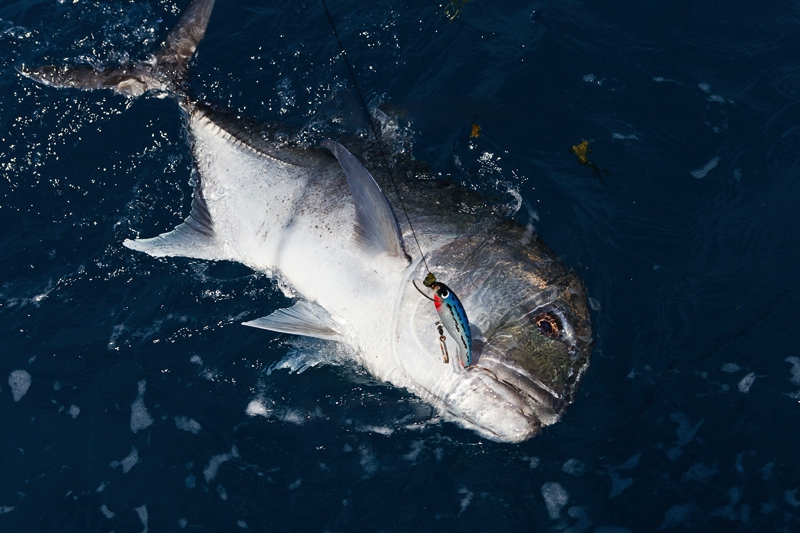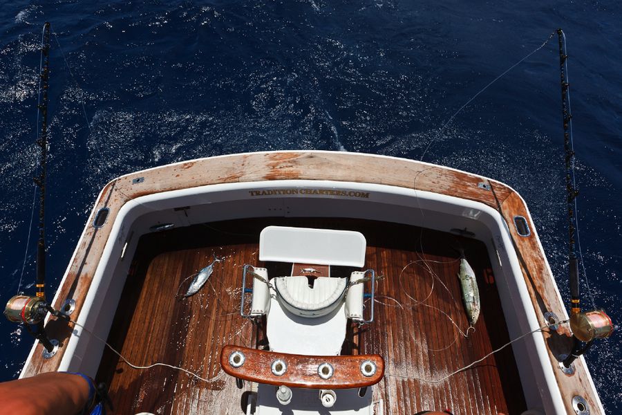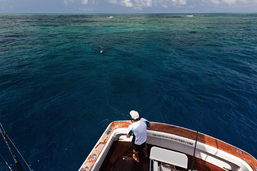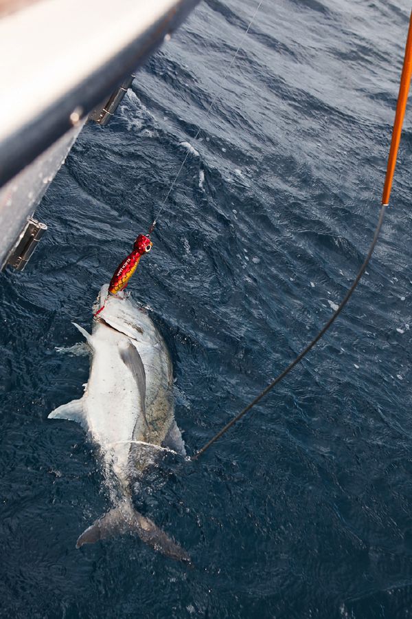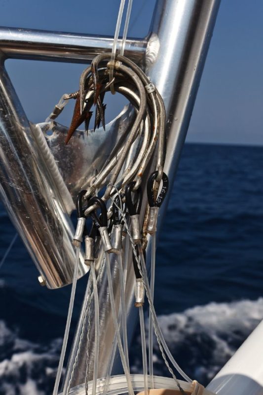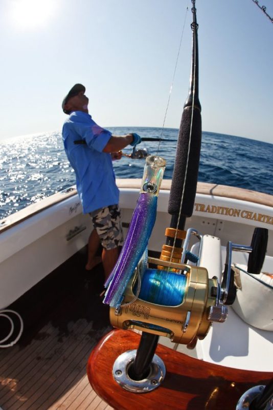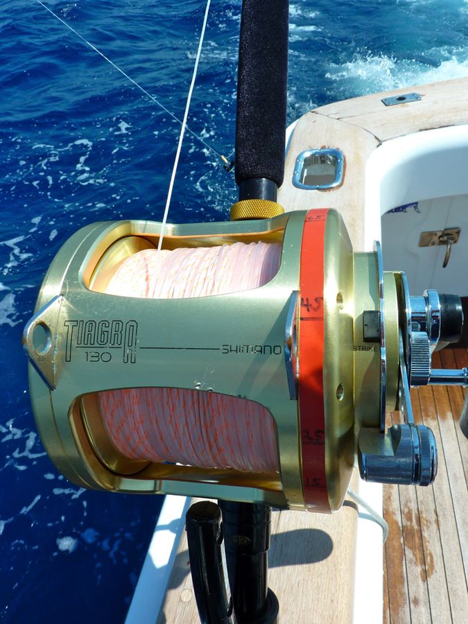 In der Regel wird dort mit 130er-Gerät gefischt. Die Ruten sind „extrahart“ und lassen sich nur unter Volllast (etwas) durchbiegen. Im Abstand von zirka 30 Metern werden zwei extra dafür (mit viel Liebe und Sorgfalt präparierte) tote Köderfische über die Outrigger mit zirka sieben Knoten an der Oberfläche geschleppt; dabei wird ein „Drop Back Slack“ von zwanzig Metern ausgelegt und nachgezogen. Nach einem Hook-Up muss der Angler den Marlin so schnell wie nur möglich ans Boot drillen; ansonsten besteht die große Gefahr, dass er von den vielen Riffhaien aufgefressen wird. So läuft es in der Regel so ab: Wenn der Biss kommt, zieht der Angler seine Rollenbremse zurück auf die „Free Spool“ Position, beobachtet den Lauf der Leine und richtet sich aus, schiebt dann die Bremse auf 25 lb., kurbelt schnell ein bis er den Zug deutlich spürt und geht sogleich (für zirka zwanzig Sekunden) auf 45 lb. – das ist der Anschlag/Hookup! Sitzt der Haken, stellt der Angler die Bremse wieder zurück auf 25 lb., nimmt die Rute aus der Reling und setzt sich in den Kampfstuhl, beginnt sofort zu Drillen und zwar so hart wie nur möglich. Ich erhöhte in dieser Hauptdrillphase die Bremskraft zeitweise bis auf 65 lb. – mich hat es dabei dreimal aus dem Stuhl gehebelt!