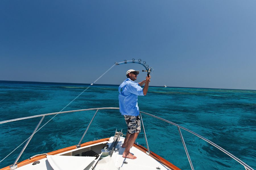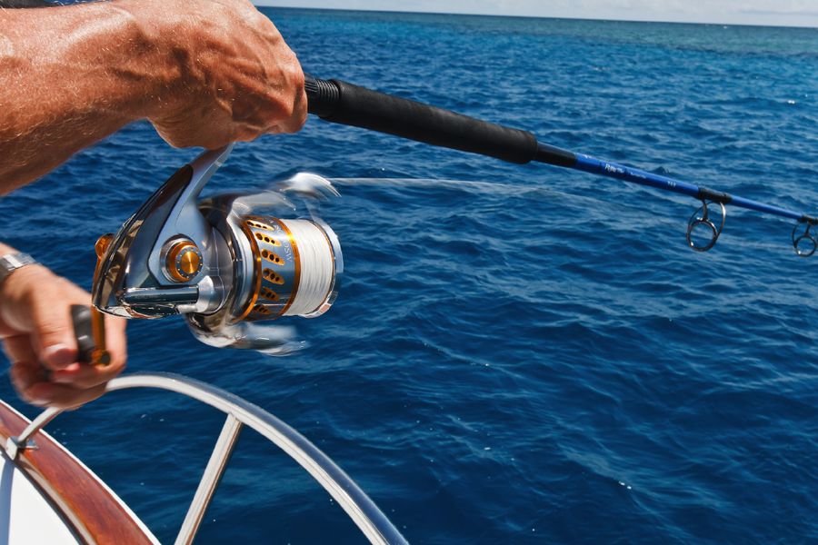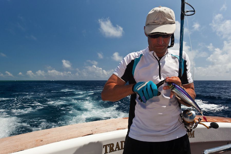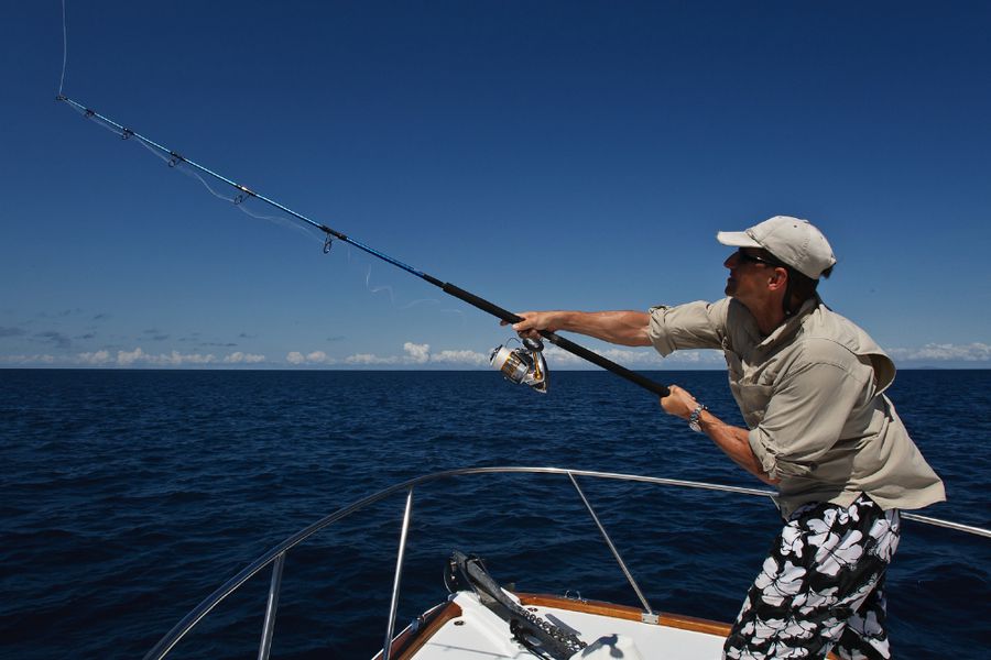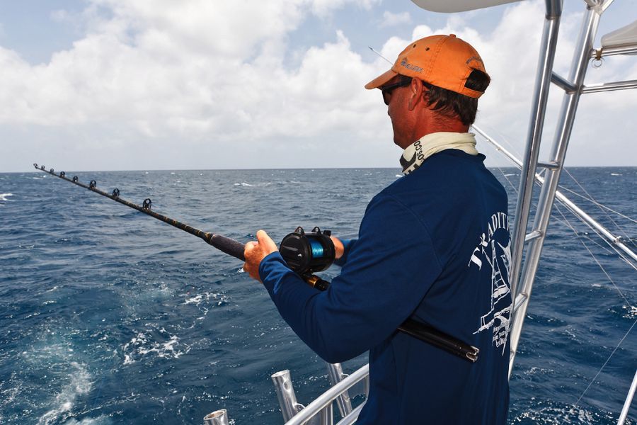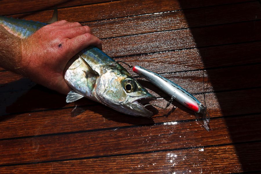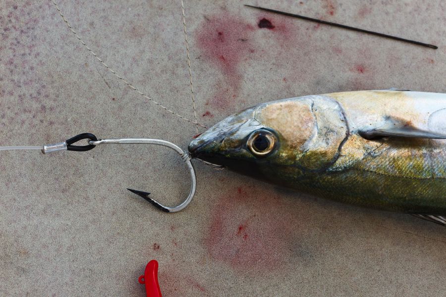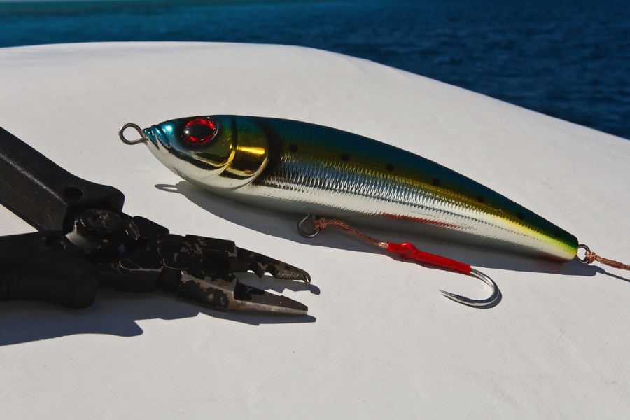 In der Regel wird dort mit 130er-Gerät gefischt. Die Ruten sind „extrahart“ und lassen sich nur unter Volllast (etwas) durchbiegen. Im Abstand von zirka 30 Metern werden zwei extra dafür (mit viel Liebe und Sorgfalt präparierte) tote Köderfische über die Outrigger mit zirka sieben Knoten an der Oberfläche geschleppt; dabei wird ein „Drop Back Slack“ von zwanzig Metern ausgelegt und nachgezogen. Nach einem Hook-Up muss der Angler den Marlin so schnell wie nur möglich ans Boot drillen; ansonsten besteht die große Gefahr, dass er von den vielen Riffhaien aufgefressen wird. So läuft es in der Regel so ab: Wenn der Biss kommt, zieht der Angler seine Rollenbremse zurück auf die „Free Spool“ Position, beobachtet den Lauf der Leine und richtet sich aus, schiebt dann die Bremse auf 25 lb., kurbelt schnell ein bis er den Zug deutlich spürt und geht sogleich (für zirka zwanzig Sekunden) auf 45 lb. – das ist der Anschlag/Hookup! Sitzt der Haken, stellt der Angler die Bremse wieder zurück auf 25 lb., nimmt die Rute aus der Reling und setzt sich in den Kampfstuhl, beginnt sofort zu Drillen und zwar so hart wie nur möglich. Ich erhöhte in dieser Hauptdrillphase die Bremskraft zeitweise bis auf 65 lb. – mich hat es dabei dreimal aus dem Stuhl gehebelt!