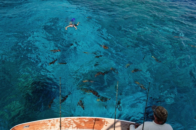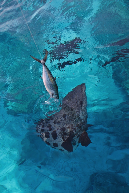 Dann kam eine „Angelpause“ und es stand Schnorcheln plus fischen mit der Harpune auf dem Programm – eine große Leidenschaft der Australier. Die Jungs schossen mit Vorliebe Coral Trouts; diese exzellenten Speisefische stehen scheinbar aber auch bei den Haien ganz oben auf dem Speisezettel! Ich schnorchelte schon in vielen Riffen, aber was ich am Great Barriere Reef bestaunen und entdecken durfte, ist meines Erachtens „überparadiesisch“. Hier nur ein kleiner Teil dortigen Artenvielfalt: Riffhaie, Schildkröten, Rochen, Korallenbänke in allen nur erdenklichen Farben, Barrakuda-Schwärme, Seeschlangen und Goliatgrouper bis 300 lb. – die ich mit der Hand füttern konnte und vor denen sogar die Haie einen weiten Bogen machten! Das tägliche Schnorcheln war für mich eine Zeit der Ruhe und Entspannung; auch erkannte ich dabei erneut, dass ein Erleben und Fühlen „der Leichtigkeit des Seins“ tatsächlich realisierbar ist. Auch hatte ich den Eindruck, dass dort noch nie ein Mensch vor mir im Wasser war.