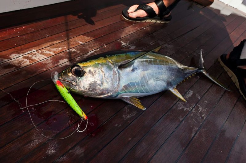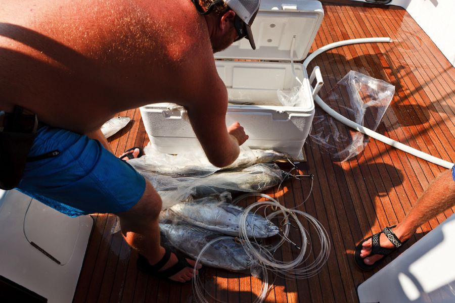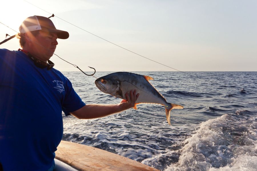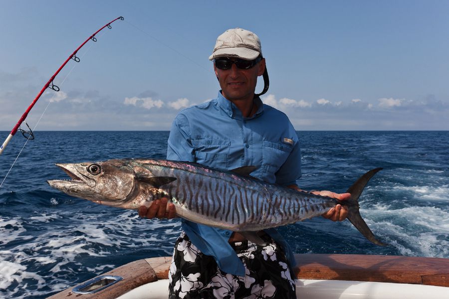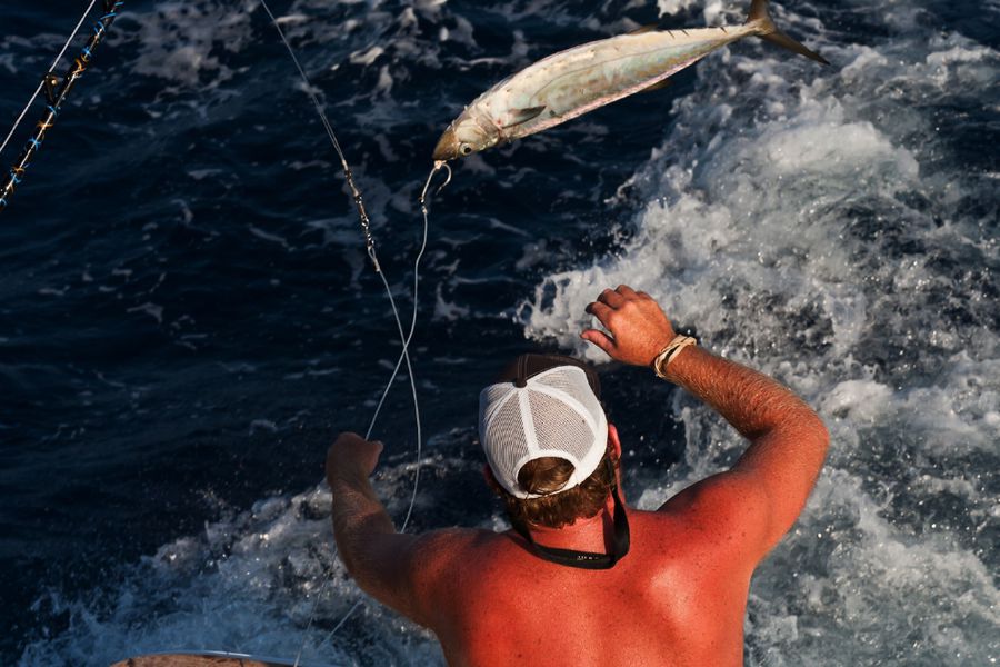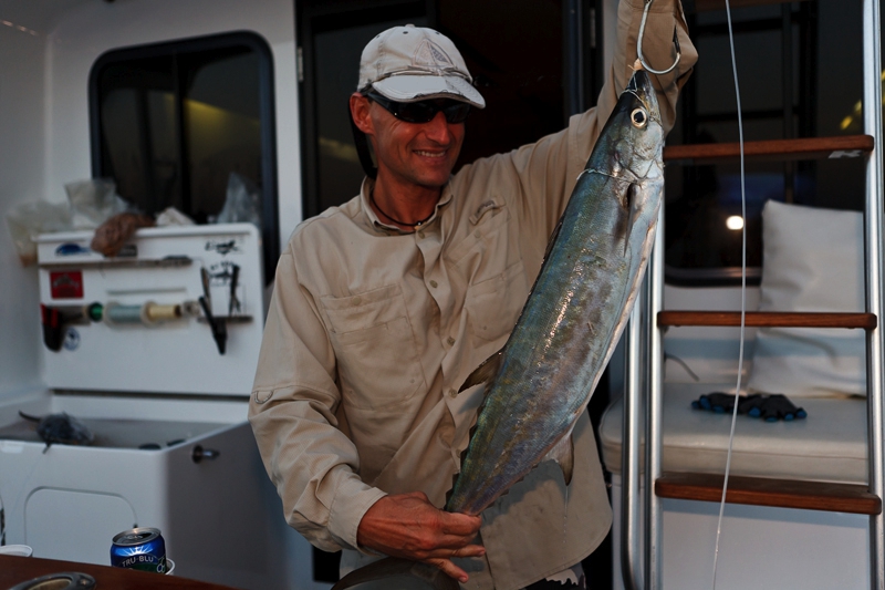 Gegen halb acht in der Früh gab es Frühstück. Dann kam der Köderfischfang, das hieß: Jeden Morgen gezieltes, intensives und erfolgreiches Lighttacklefischen auf Kingfish, Makrelen, Skipjacks, Yellowfins, Rainbowrunner u.A. mit Gewichten bis zu 50 lb. war ein Muss!